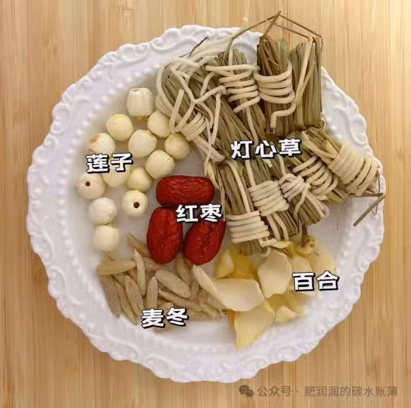 燈心草10個、麥冬5g、蓮子5g、百合10g、紅棗3個