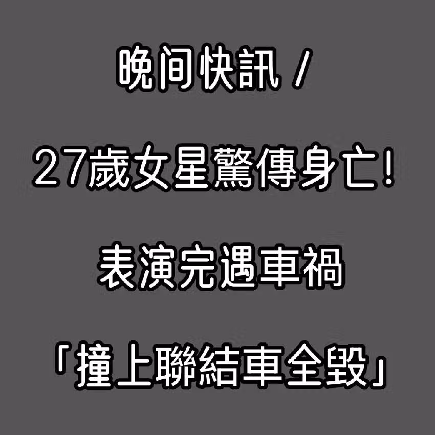 晚間快訊/27歲女星驚傳身亡!表演完遇車禍「撞上聯結車全毀」...