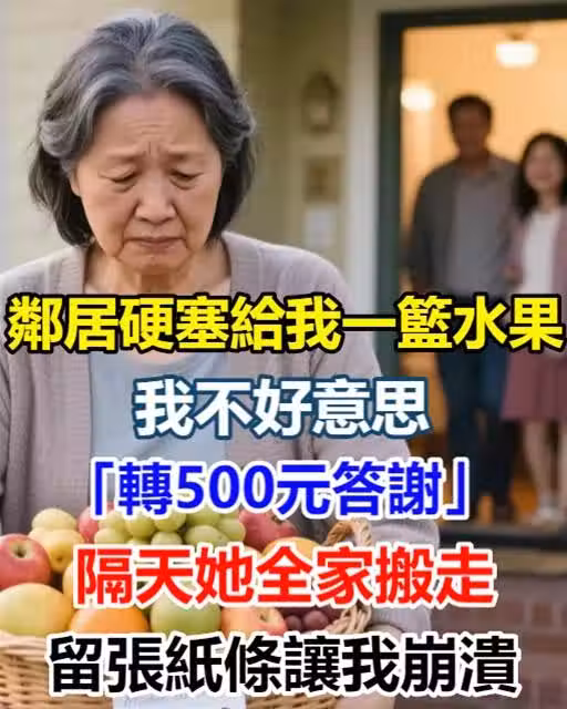 鄰居硬塞給我一籃水果!我不好意思「轉500元答謝」,隔天她全家搬走,留張紙條讓我崩潰...