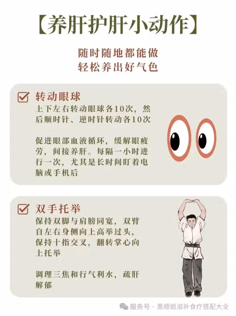 5️⃣ 眼球運動:上下左右轉動眼球各10次,然後順時針、逆時針轉動各10次。有助於促進眼部血液循環,緩解眼疲勞,間接養肝。建議每隔一小時進行一次,尤其是長時間盯著電腦或手機後。