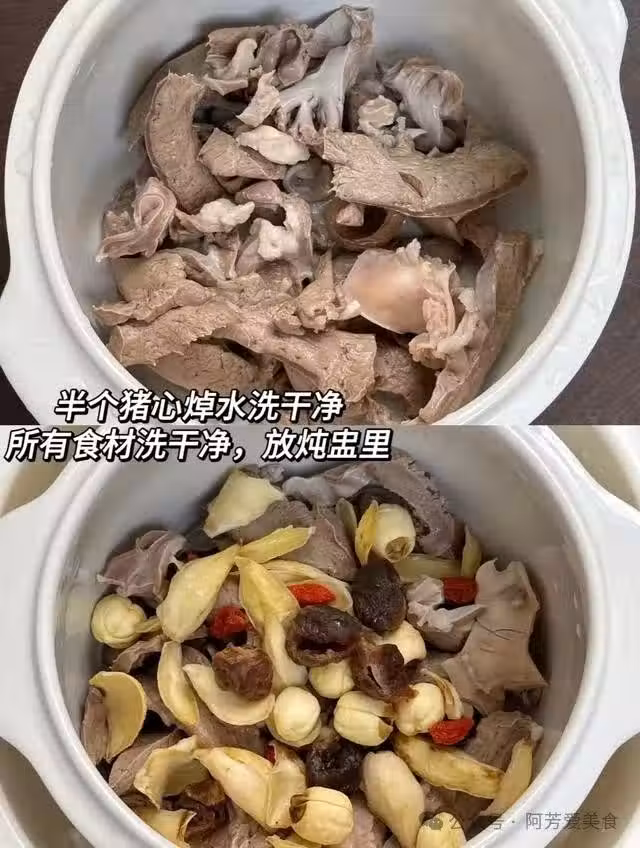 豬心對半切開,撕掉表面白色筋膜,切成硬幣厚的片。加兩勺麵粉使勁揉搓,清水沖凈黏液,重複兩次。冷水下鍋,放薑片煮到沸騰,撇去浮沫後撈起瀝干。