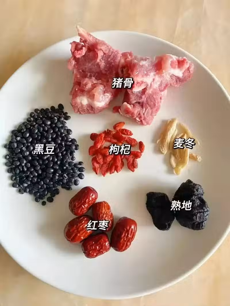食材:豬骨2塊、黑豆20克、熟地15克、麥冬8克、紅棗5個、枸杞10克