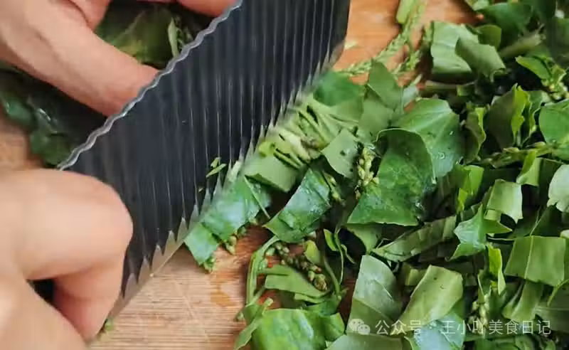 把控干水分的車前草放在案板上,用刀將其切成條狀。切成條狀不僅能讓車前草在後續的炒制過程中更容易脫水變干,還能使其營養成分更好地釋放出來。切好後,將車前草條裝入盤中備用。