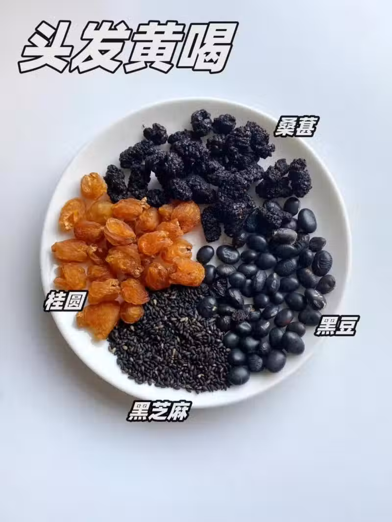 桑葚滋陰養血,含烏髮素及鐵元素,協同黑豆、黑芝麻促進毛囊黑色素生成,緩解頭髮乾枯、分叉。黑豆花青素清除自由基,保護細胞膜。黑芝麻維生素E與亞油酸協同抗氧化,減少脂質過氧化損傷。