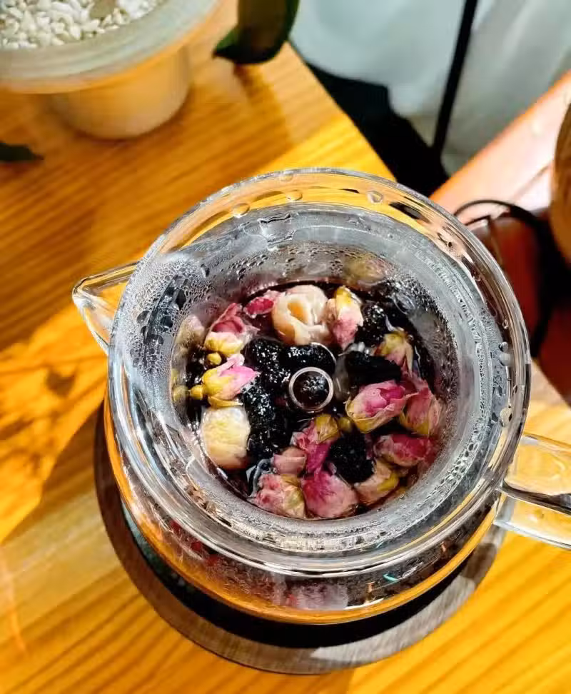 桑葚:可改善貧血、緩解眼疲勞、延緩衰老。玫瑰:疏肝解郁、活血調經,含揮髮油及黃酮類物質。可緩解經期不適、改善情緒、美容養顏。枸杞:明目養血,增強免疫力、保護視力、抗疲勞,桂圓乾:補益心脾、養血安神,含葡萄糖、鐵元素。改善失眠、心悸、體虛乏力。紅棗:補中益氣、養血安神,含維生素C、鐵及環磷酸腺苷。增強體力、調理脾胃、改善面色。 養生茶配方: ▪️桑葚 10 顆|▪️玫瑰 10 顆 ▪️枸杞一小把|▪️桂圓乾 8 顆 ▪️紅棗 5 顆(記得去核!)