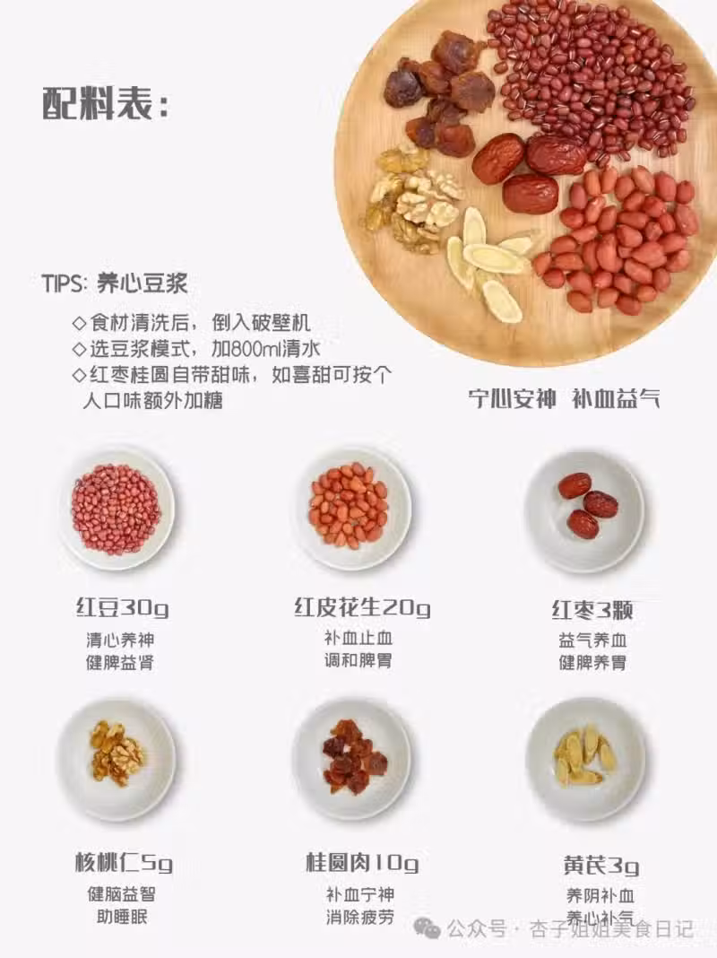 紅豆30g+紅皮花生20g+桂圓10g+核桃5g+紅棗3顆+黃芪3g