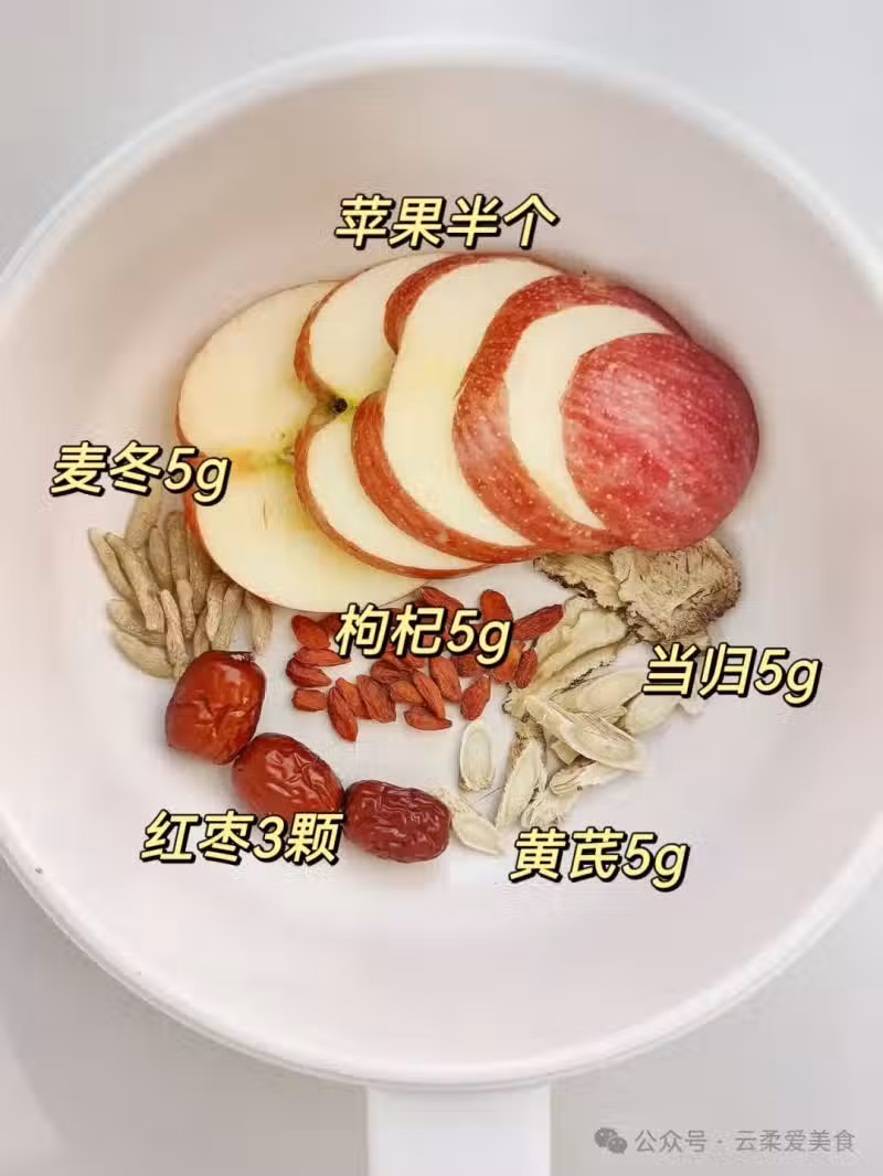食材:蘋果半個、當歸5克、黃芪5克、麥冬5克、紅棗3顆、枸杞5克
