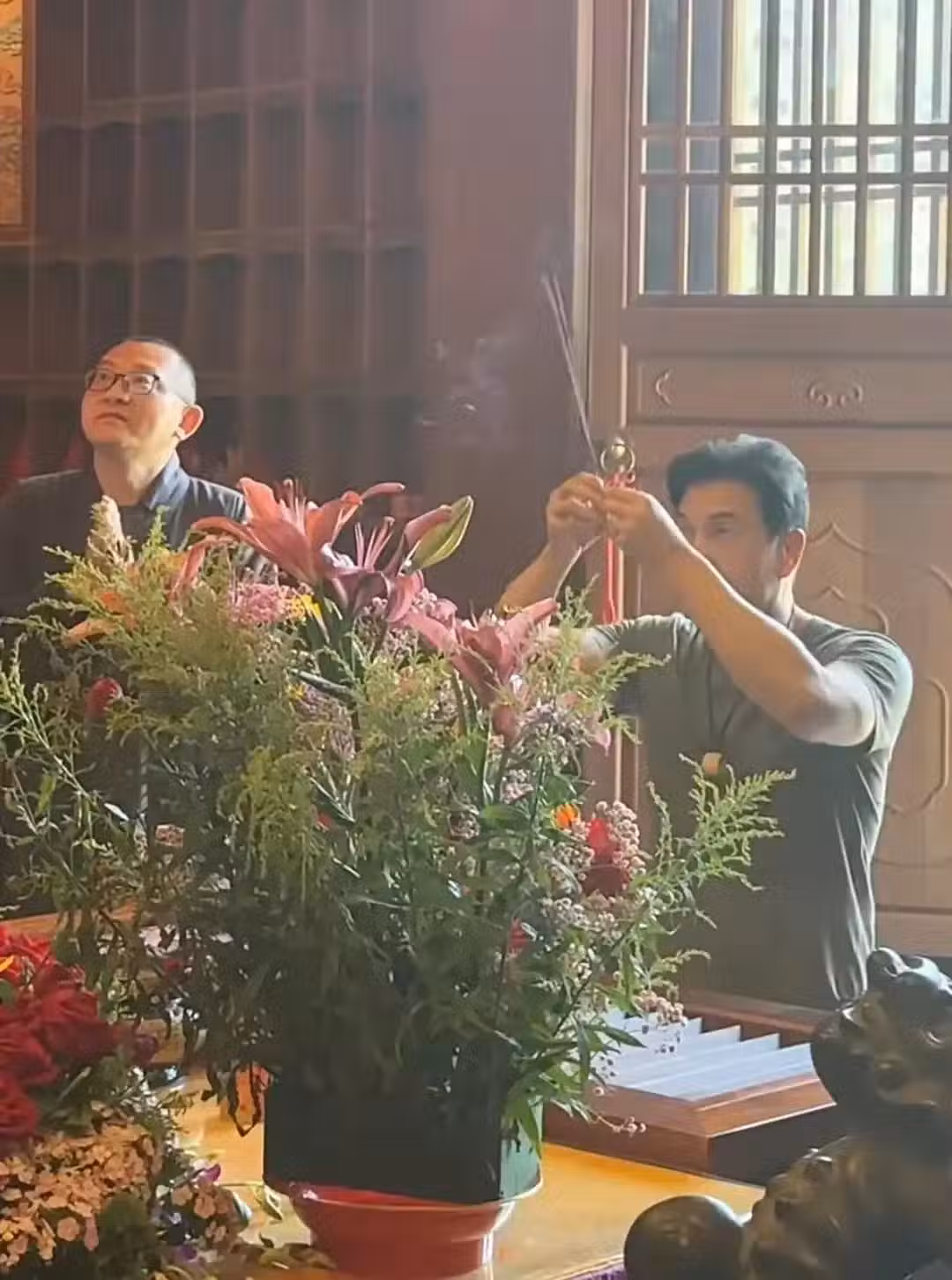 他到寺里上香祈福,雙手舉著三根香過頭頂,雙腿跪地,閉著眼睛虔誠地祈禱,看起來好莊嚴肅穆!-----------------------
