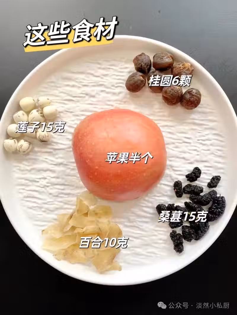 食材:蘋果半個、桂圓6顆、蓮子15克、百合10克、桑葚10克,洗凈加入煮20分鐘即可。