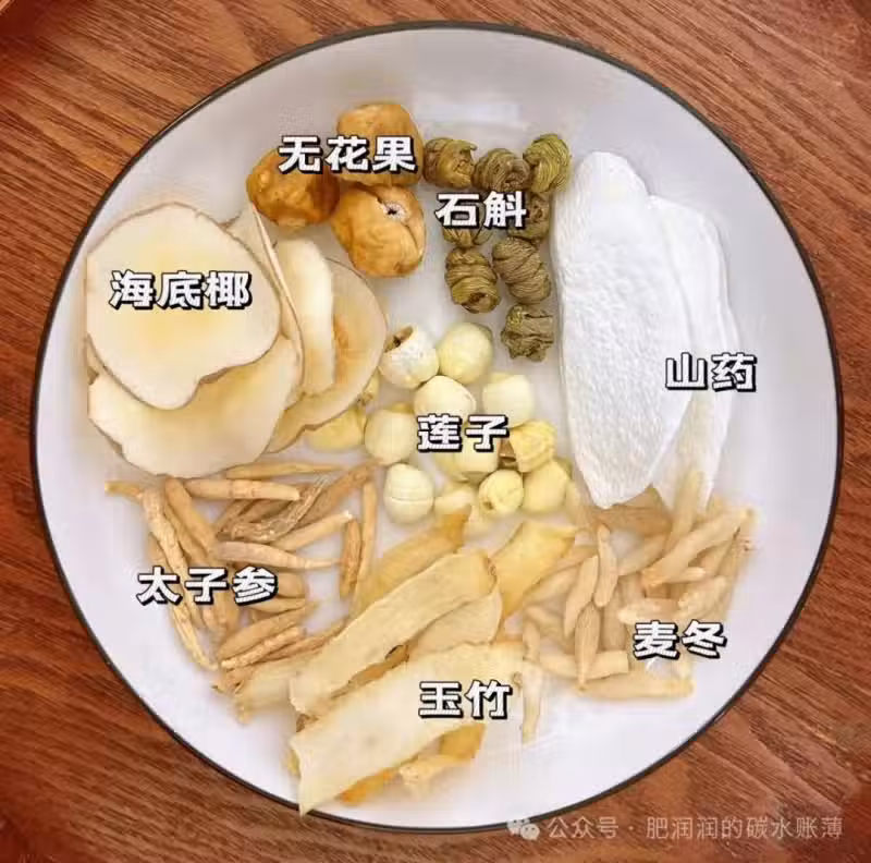 食材:太子參5g、石斛10g、山藥10g、海底椰6片、蓮子10g、無花果3顆、玉竹8g、麥冬8g