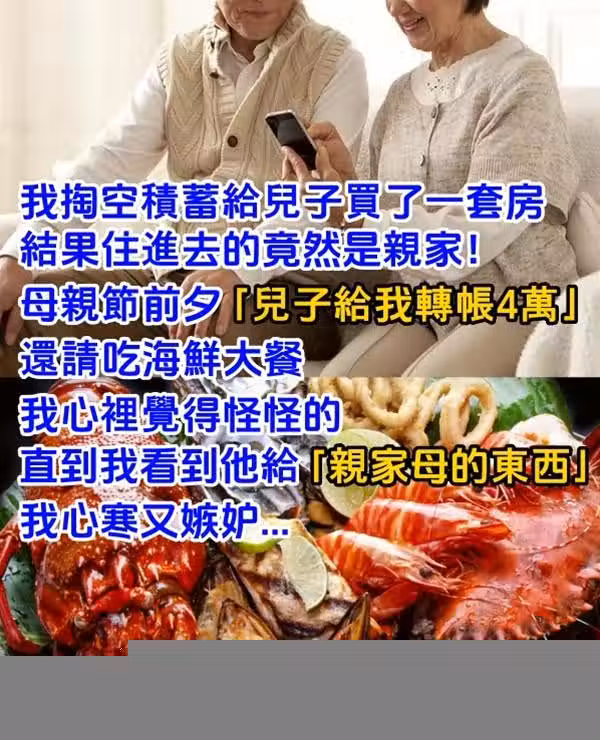 我掏空積蓄給兒子買了一套房,結果住進去的竟然是親家!母親節前夕「兒子給我轉帳4萬」還請吃海鮮大餐,我心裡覺得怪怪的,直到我看到他給「親家母的東西」我心寒又嫉妒...