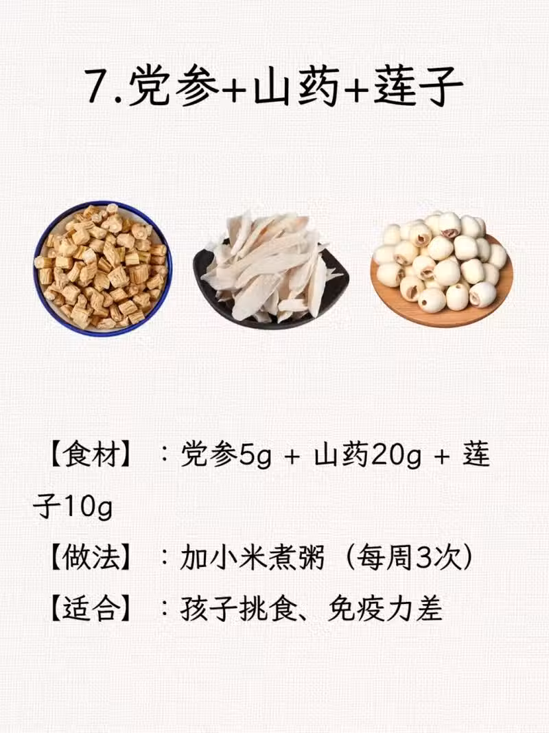 7. 黨參+山藥+蓮子:健脾固腎,調理消化不良