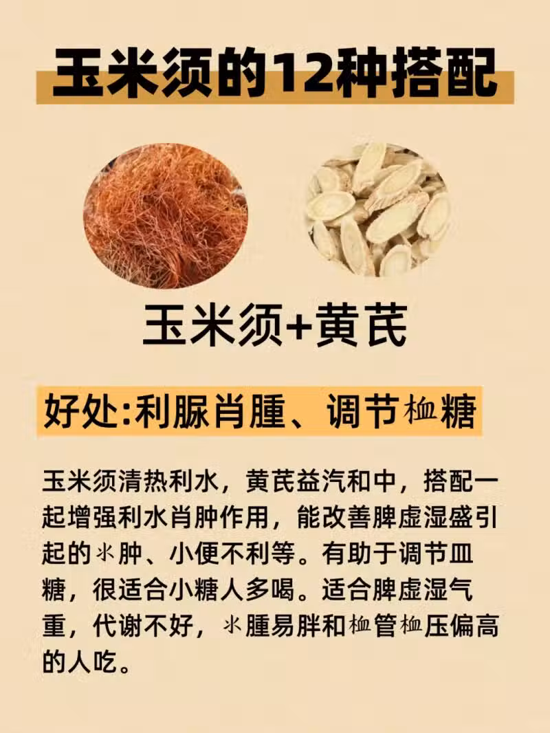 5. 玉米須+黃芪:黃芪補氣固表,和玉米須搭配,氣血雙補 。