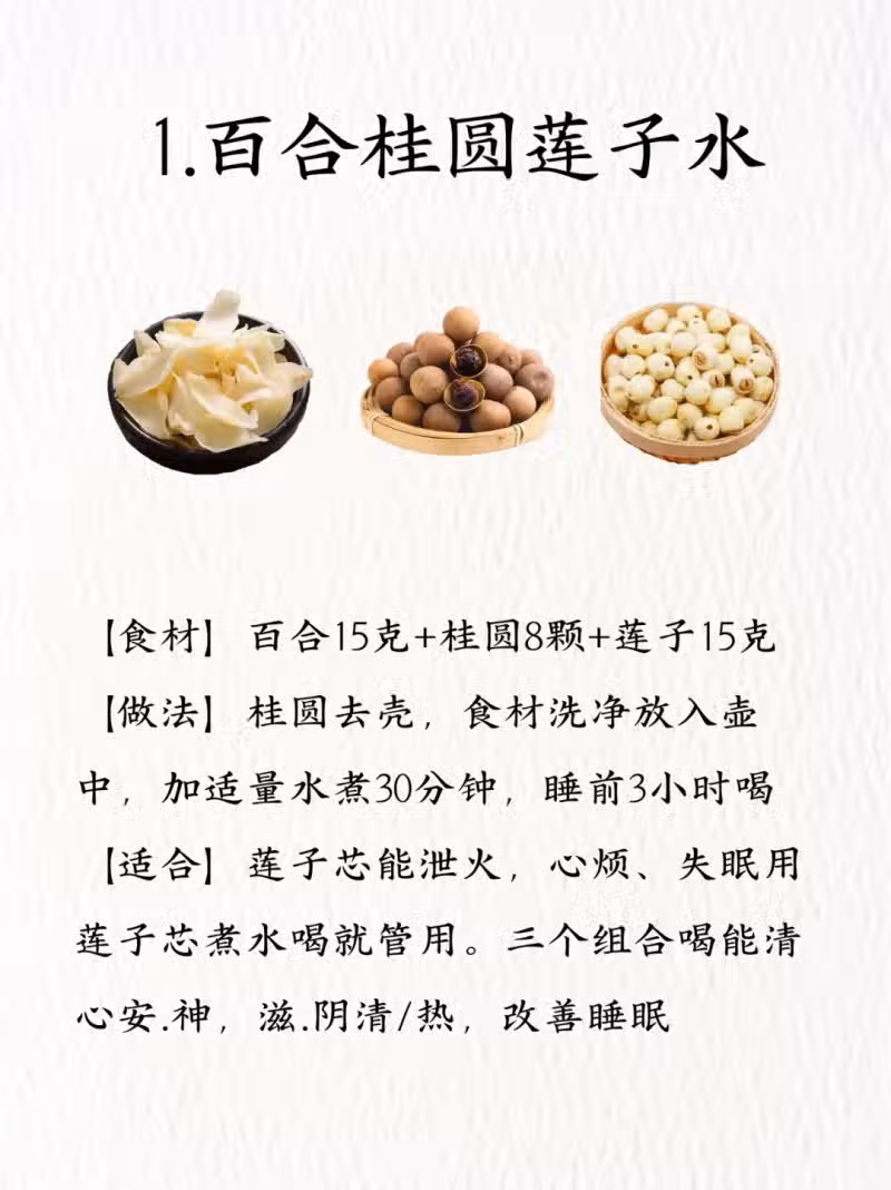 1. 百合桂圓蓮子水:蓮子芯泄火效果好,心煩失眠時,用它煮水喝很管用。百合、桂圓、蓮子三者搭配,能清心安.神、滋陰清.熱,有效改善睡眠。