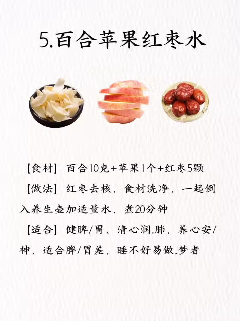 5. 百合蘋果紅棗水:能健脾益胃、清心潤肺、養心安.神,適合脾胃差、睡不好且易做夢的人。