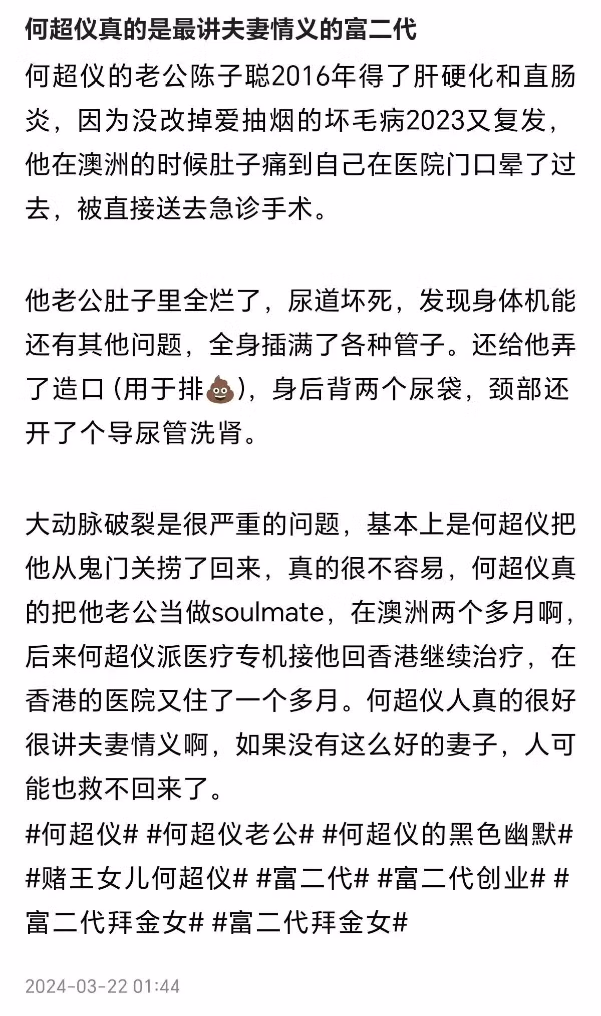 2023年底,陳子聰生病被送到醫院搶救命懸一線,是何超儀花費巨資,請專家幫他治療做手術,最後才救回來的。