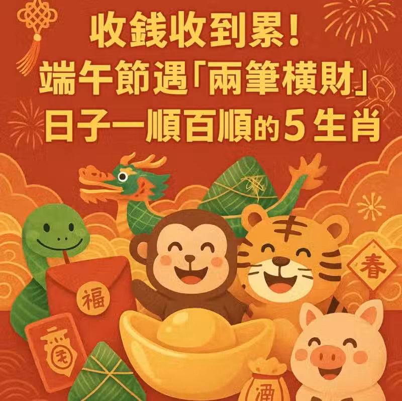 2025年端午節落在5月31日(農曆五月初五),這一天是天時地利人和的大吉日,命理上「財星臨門」「吉門開運」,以下5個生肖在這段時間橫財連連、貴人報喜,收錢收到手軟!