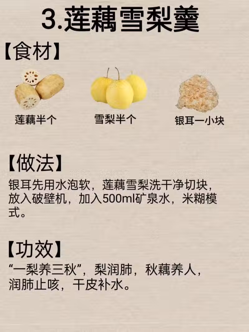 3.蓮藕雪梨羹 所謂「一梨養三秋」,梨潤肺,秋藕養人,潤肺止咳,干皮補水。