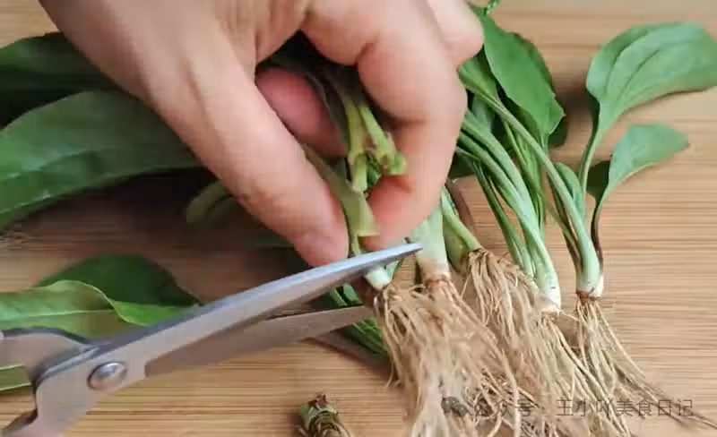利用煮綠豆的這 10 分鐘時間,我們來處理車前草。將從野外採挖回來的車前草放在水龍頭下,簡單沖洗一下表面的泥土。然後,用剪刀把車前草根部的位置剪掉。根部通常比較老,而且容易藏污納垢,剪掉之後清洗起來會更加簡單快捷。