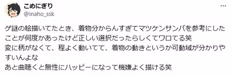 「我也聽說有人在找走動時衣擺掀起的參考資料,結果後來在『松健森巴』裡面,把需要的素材全部收集到了。雖然我記不太清楚詳細內容了。」