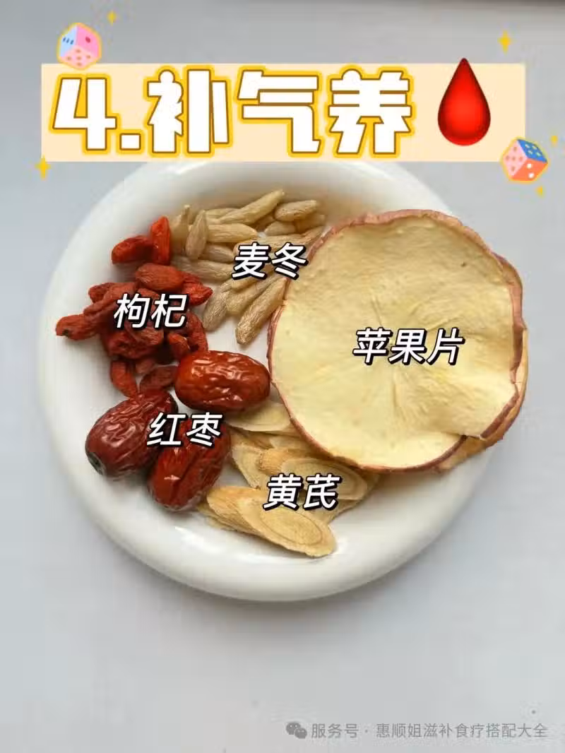 食材:麥冬10克、枸杞10克、蘋果片2片、紅棗3顆、黃芪10克