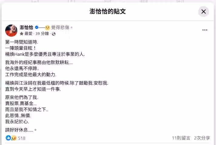 澎恰恰痛哭「47歲的他昨天過世」!死別才知暖舉:「為了我賣股票」