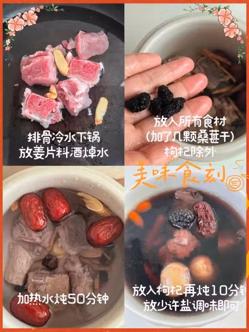 排骨500克、紅棗8顆、桂圓乾10顆、黨參1根、黃芪8片、桑葚干15克、枸杞1小把