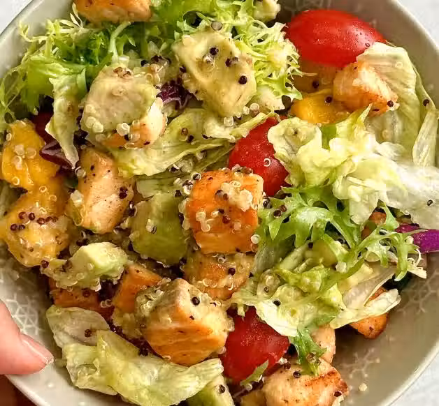 ❹碗里放入生菜、牛油果、洋蔥丁、芒果、聖女果、三文魚、藜麥,淋入沙拉汁拌勻