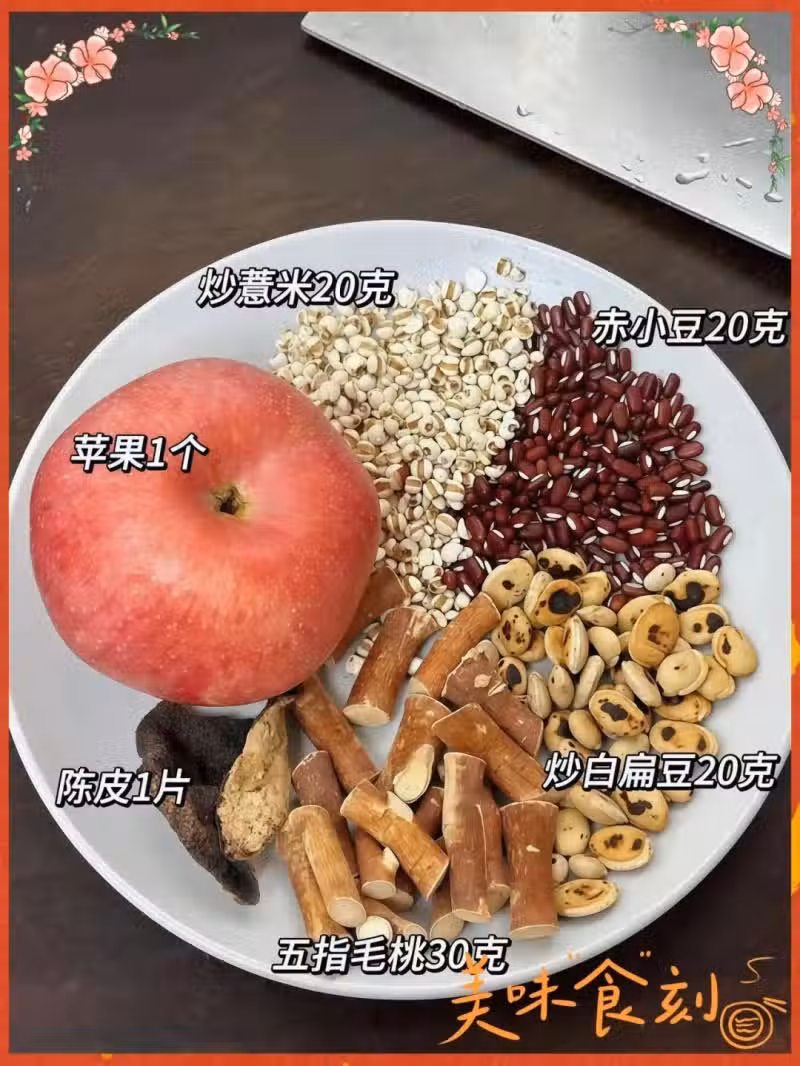 蘋果1個(去核切塊)、豬骨300克(焯水)、炒薏米20克、赤小豆20克、炒白扁豆20克