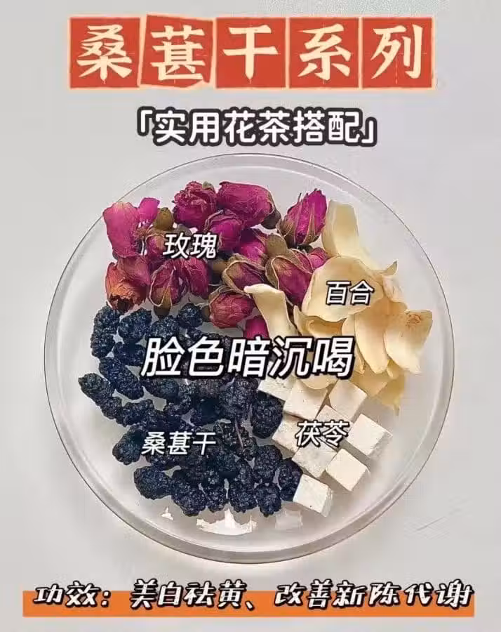 5、桑葚干+玫瑰+百合+茯苓(臉色暗沉喝)