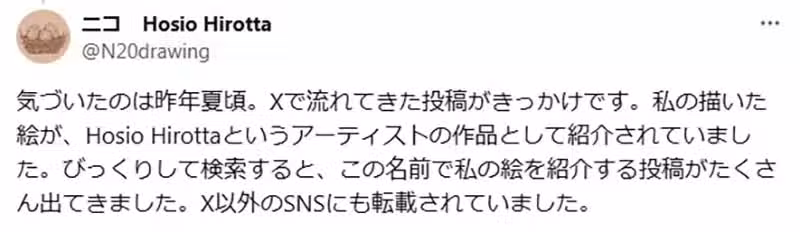 「Hosio Hirotta(星を拾った)這個句子對我來說確實有印象,而且也有文章附上了我的帳號連結,所以我知道這不是出於冒用別人的身份,他們所說的這個人確實就是我本人。看來是我原本使用的日文語句,在其他語言圈被誤以為是人名了。」