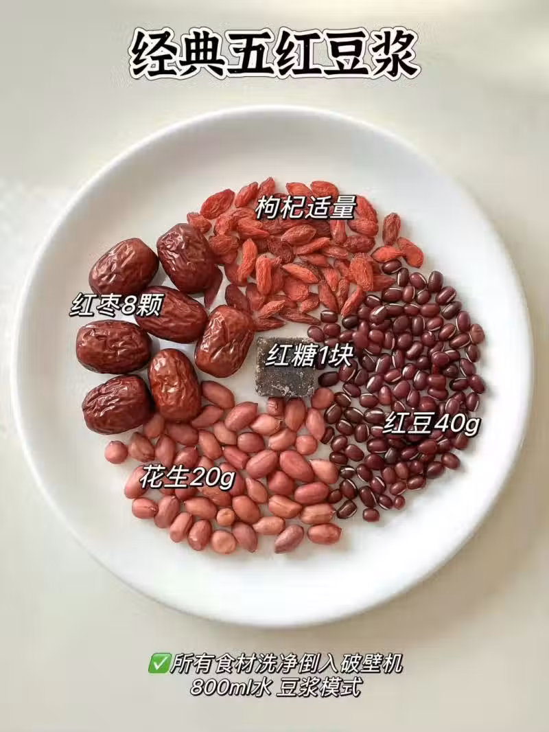 紅豆、紅棗、紅皮花生和紅糖等食材富含鐵元素和其他礦物質,能快速激活血紅蛋白再生,改善氣血不足症狀。五紅豆漿性溫,具有健脾和胃的作用,特別適合脾胃虛弱、胃寒的人群飲用。