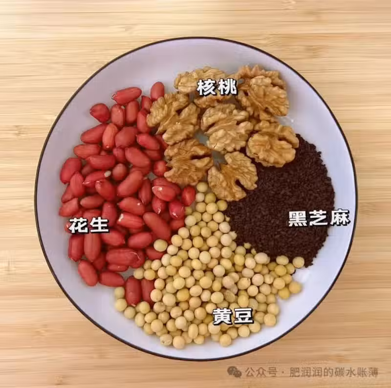 食材:核桃30g,黑芝麻10g,花生20g,黃豆20g