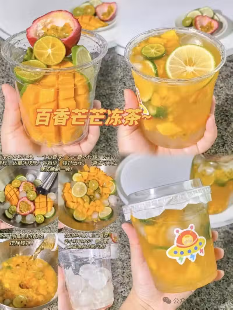 3️⃣寶子們!一口穿越到熱帶果園的百香芒芒凍茶來咯🥰! 把香甜芒果、爆汁百香果和清新檸檬與冰塊一起捶打,果香瞬間炸裂💥。再倒入茉莉清茶,攪拌均勻。滿滿一杯,果香茶香交融,每一口都是夏日的快樂~快動手試試吧!