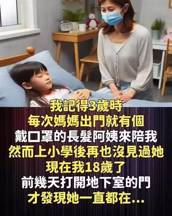 我記得3歲時,每次媽媽出門 ,就有個「戴口罩的長髮阿姨」來陪我,然而上小學後再也沒見過她!現在我18歲了,前幾天「打開地下室的門 」,才發現她一直都在...