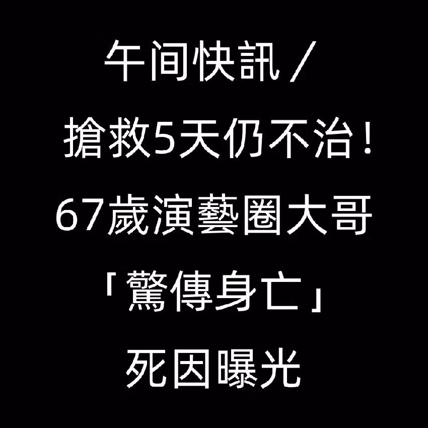 午間快訊/ 搶救5天仍不治!67歲演藝圈大哥「驚傳身亡」死因曝光