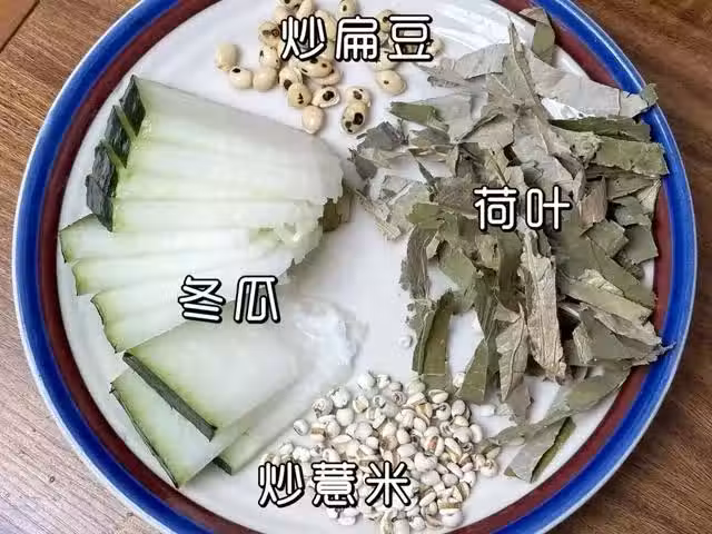 荷葉10克,冬瓜一塊,炒扁豆5克,炒薏米5克