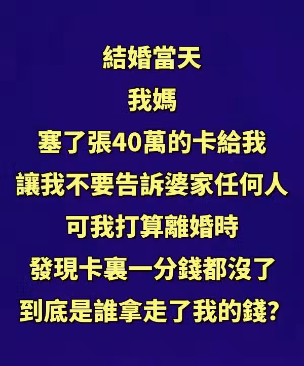 結婚當天我媽塞了張40萬的卡給我,讓我不要告訴婆家任何人...可我打算離婚時,發現卡里一分錢都沒了,到底是誰拿走了我的錢?