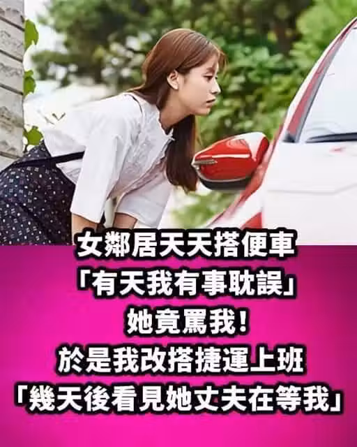 女鄰居天天搭便車「有天我有事耽誤」她竟罵我!!於是我改搭捷運上班「幾天後看見她丈夫在等我」