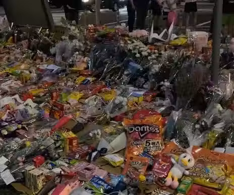 三峽北大國小19日發生車禍後,當晚就有人在學校旁的路口電線桿擺放零食、鮮花致意,後來因為數量實在太多,警方出動人員管制現場,也將哀悼物品移到一旁腹地較大的草皮,結果20日經過一天至深夜,草地上已經塞滿許多零食、鮮花、手寫卡片、食物等等,現場畫面非常震撼。