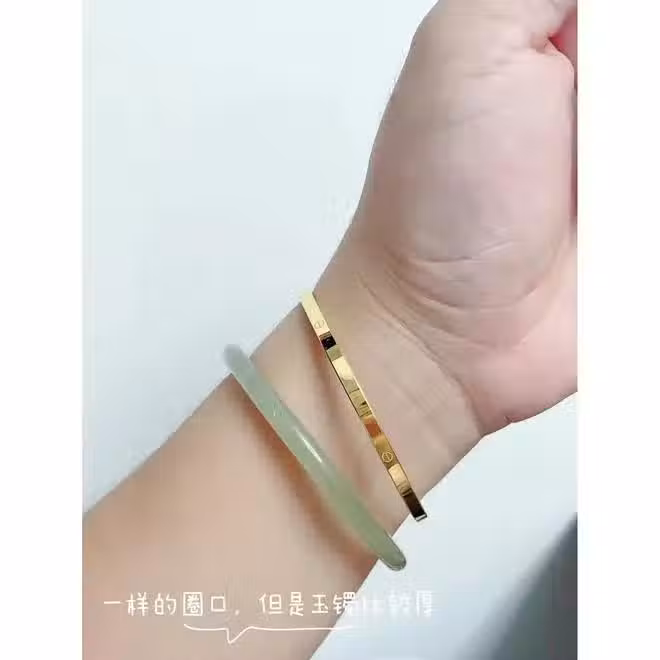 雖然是同樣的圈口,到那時玉鐲是偏圓潤的款式,一般玉鐲的內壁會更厚一些,碰撞金鐲的時候,產生的磨損也更強。