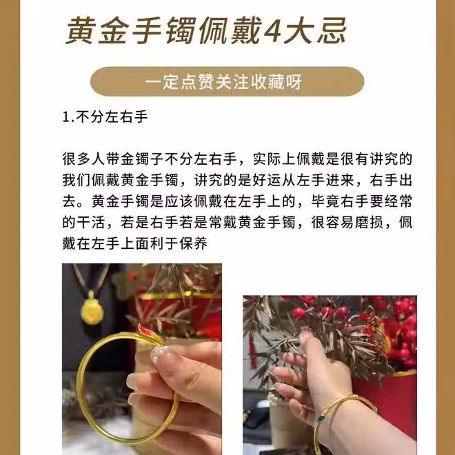 實際上佩戴黃金手鐲應該佩戴在左手上,因為右手經常幹活,很容易產生磨損。