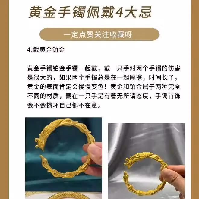 黃金手鐲既然不能與玉鐲一起佩戴,那麼也不建議與鉑金手鐲一起佩戴。兩種完全不同的材質,但鉑金硬度更高,一起佩戴還是會造成黃金磨損。