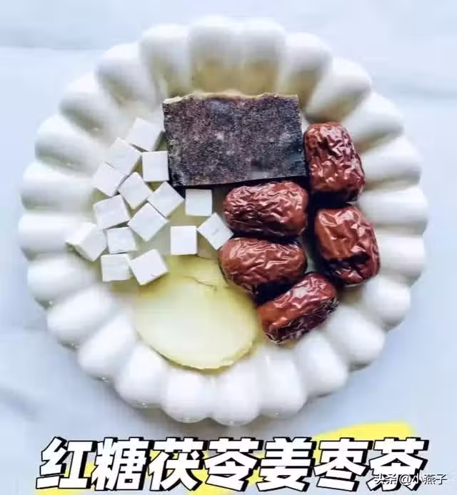 食材:紅糖8g、茯苓10粒、生薑2片、紅棗3顆。