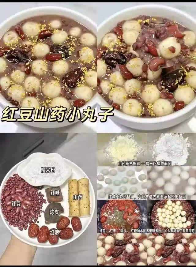 做法:山藥蒸熟搗碎加糯米粉揉成麵糰,搓成小丸子備用;水開放入丸子煮至浮起撈出;紅豆、紅棗、陳皮、紅糖加水按煮粥鍵煮熟,加入煮好的丸子煮開即可。