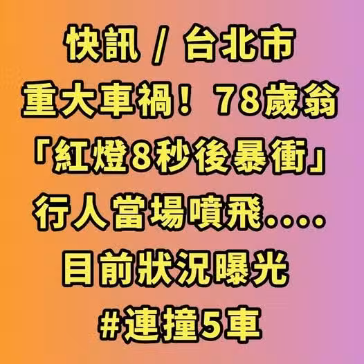 快訊/台北市重大車禍!78歲翁「紅燈8秒後暴沖」行人當場噴飛....目前狀況曝光 #連撞5車