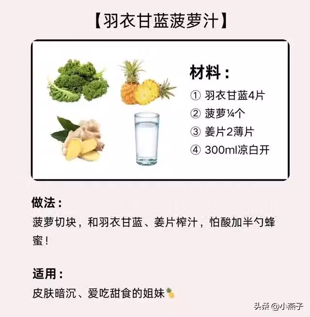 做法:菠蘿切塊+羽衣甘藍、薑片榨汁,怕酸加半勺蜂蜜。