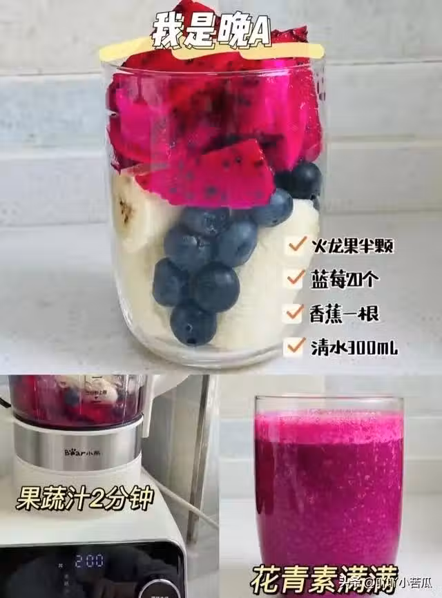 食材:半顆火龍果+20顆藍莓+1根香蕉+300ml水。