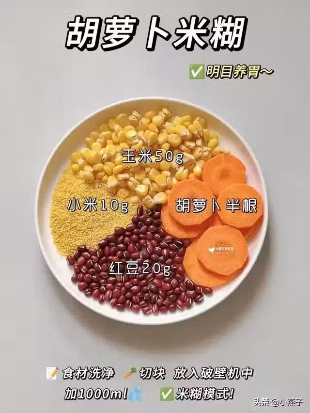 食材:玉米50g+胡蘿蔔半根+核桃20g。