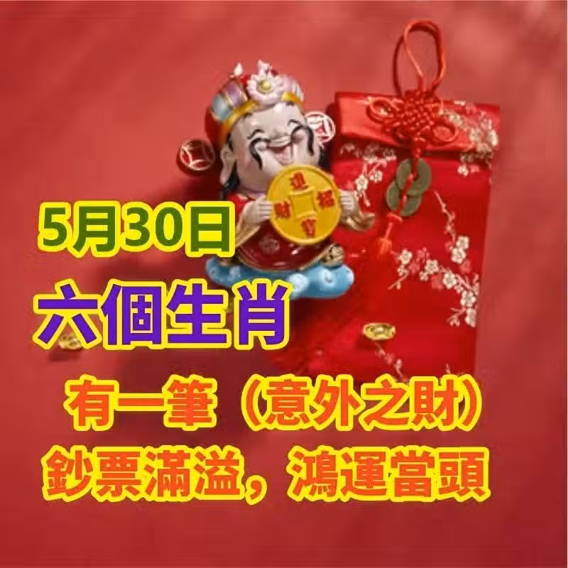 5月30日,六個生肖有一筆(意外之財)鈔票滿溢,鴻運當頭。
